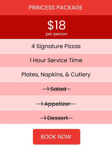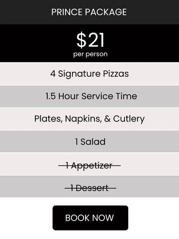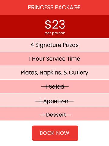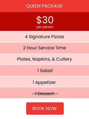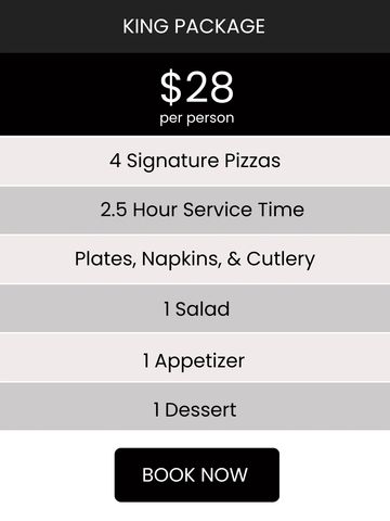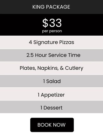 We offer buffet-style catering designed to make your event easy and delicious. Simply choose the package that best fits your party vibe, pick your favorite signature pizzas, and we’ll take care of the rest. Each package includes a set service time where our team will be on-site serving hot, fresh pizza straight from the oven. Whether you're planning a wedding, a birthday bash or a corporate lunch, our catering options are built to deliver an unforgettable food experience.